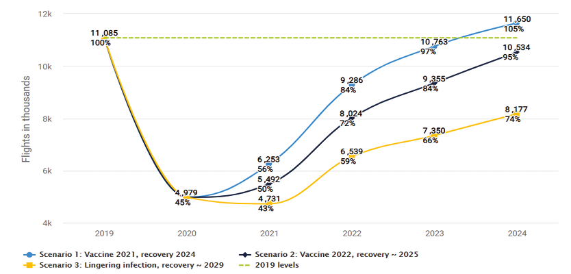In the first scenario created by EUROCONTROL on April 24, 2020, a gradual recovery from April 2020 to the end of August 2020 and with a decrease by 45% or less than 5 million in February 2021 was predicted to reach a decrease of 15% compared to 2019. However, with the expected flights in Europe being less than 55% compared to 2019, 1 million fewer flights than previously estimated, and the re-emergence of Covid-19 in mid-August, the scenario previously created by EUROCONTROL was updated by the report published on November 4, 2020. In this report; widespread availability of the vaccine (or end of a pandemic) by Summer 2021 was called scenario 1; widespread availability of the vaccine (or end of a pandemic) by Summer 2022 was called scenario 2; lingering infection and low passenger confidence were called scenario 3. According to scenario 1 seen as the most optimistic among the scenarios, it is estimated that air traffic will return to 2019 levels by 2024, and in the second scenario to most likely occur, the traffic in 2024 will be only 92% of the 2019 level. According to the third scenario, it is predicted that the number of traffic in 2024 will be 75% of 2019 and that the numbers of traffic in 2019 will not be reached until 2029 (EUROCONTROL, 2021d).