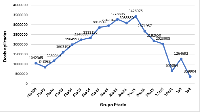 En la figura 1 se aprecia el comparativo de dosis aplicadas para COVID-19 y el grupo etario, con fecha de corte el 30-11-2021. En ella podemos inferir que los grupos etarios con mayores dosis aplicadas están: de 25-29 años con 3’426.075, 35-39 años con 3’278.605, 30-34 años con 3’085.850. Y los grupos etarios con menores dosis aplicadas tenemos: 3-4 años con 359.904, 10-11 años con 655.064, y 75-79 años con 848.933.