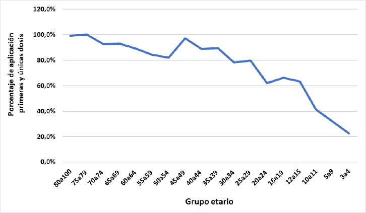 Percentage of application of first and only doses by age group against SARS-CoV-2 in Colombia