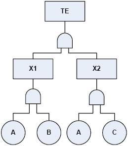 Comparing the probabilities of the top event given by Equations (6) and (7), it can be seen that the fault tree in Figure 2 underestimates the top event by a factor of P(A). Similarly, if X1 and X2 were connected to TE by means of an OR gate, the respective probability would be overestimated instead. Although such limitations of conventional fault trees can be relaxed by relying on state-dependent methods such as Markov chains and Bayesian networks.