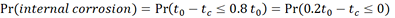 To calculate the probability of internal corrosion in Figure 4 (it has been shaded for the sake of better visual identification), we apply the concept of static physical reliability models based on a comparison between the strength of the component of interest (pipeline in this work) and the stress the component is subjected to. For this purpose, it is assumed that from an internal corrosion point of view the pipeline wall’s initial thickness can be considered as the strength, denoted by t_0, while the reduction in the wall thickness can be considered as the stress, represented by t_c. It is also assumed that the pipeline failure (rupture) takes place when the corrosion-induced thickness reduction is greater than or equal to %20 of the initial thickness. In other words: