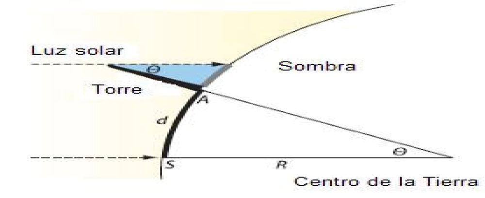 Ahora, cuando una persona está parada en un lugar llano sobre la superficie de la Tierra es complicado percibir su curvatura. Da la sensación de que, más allá de las rugosidades del terreno, la persona se encuentra sobre una superficie plana. En cada lugar sobre la superficie de la Tierra, esa superficie plana sobre la que nos da la impresión de que caminamos o sobre la que se trazan las sombras de los diferentes objetos, es perpendicular a la vertical en el lugar de la Tierra donde uno se ubica. Consecuentemente, la sombra de un objeto delgado en posición vertical (como la torre que midió Eratóstenes que se muestra en la figura 4, y el objeto constituyen un ángulo recto entre sí. (López, 2007)