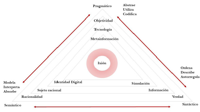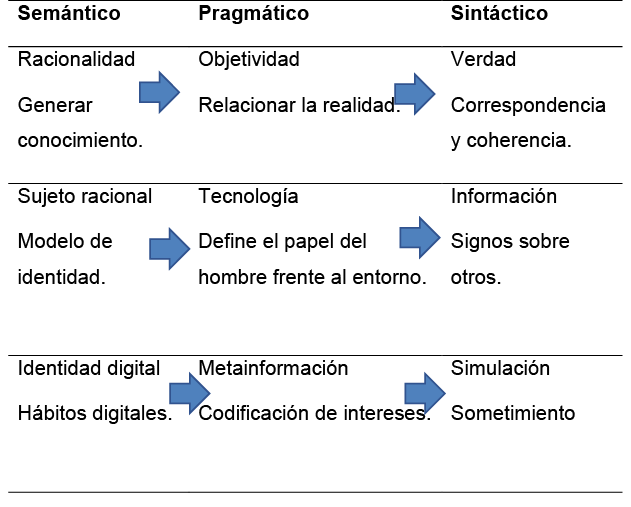La tabla 1 muestra los elementos que se pueden considerar los interactuantes de un sistema de símbolos, que a través de la forma en que se percibe el sujeto y la manera en que se construye, definen su identidad y su papel frente a su realidad. La perspectiva gnoseológica, la podemos observar en la primera columna, siendo aquella que define la fuente del conocimiento, la racionalidad que a su vez limita una identidad racional y desemboca en la generación de una identidad digital, que se manifiesta en hábitos de consumo y formas de acceso a los contenidos digitales, estos pueden ser racionales o empíricos dependiendo de la forma en que se acerquen o definan la forma de construcción de conocimiento. Lo que nos lleva, a la segunda columna, los elementos pragmáticos, que son la forma de acercarse al objeto y definir herramientas para generar conocimiento. Lo que genera una episteme característica de cada etapa de desarrollo de la tecnología, siendo representativa de las sociedades informacionales, la episteme procedural. La posición ontológica se puede observar en la tercera columna, siendo la relación del sujeto con la realidad. Que puede ser coherentista o correspondentista, como en el caso de las verdades modernas, o simplemente descriptiva y demasiado abstracta como en las sociedades informacionales, lo que arrastra, al sometimiento de la simulación ejemplificada en la metáfora de Ixión y Néfele.