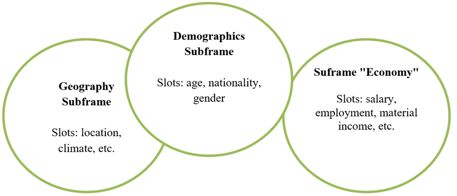 At the same time, V.N. Telia emphasizes that a concept cannot be called a concept if it is not based on a frame – that is, knowledge structured into an image, a mental representation that is not always associated with a specific verbalization. This, according to the researcher, is the difference between the "concept" and the "notion": "it reflects not just the essential features of the object, but all those that in this language community are filled with knowledge about the essence" (Telia, 1996). Frames in the framework of sociology are interpreted as ordered sub-systems of knowledge and ideas about the phenomenon under study (Minsky, 1979). From the point of view of linguistics, frames are a kind of schematized constructs that fill the semantic field of the studied image. Frame structures, in turn, have several layers (Glushkova & Zaitseva, 2017). The base layer represents the most common and basic concepts, such as geography, demography, history, economy, culture, etc. They can be defined as subframes. Subframes are characterized by invariant slots similar in meaning, which contain symbols and knowledge about the subject under study. An example of the frame structure is shown in Figure 1.