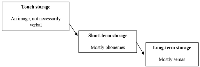 Within the framework of the psychology section studying memory, a person is presented as a kind of information storage, a kind of computer capable of using basic stimulus and reaction processes to hold, store and process a certain amount of information (Kulikova, 2021). According to the ideas of leading foreign psychologists D. Broadbent, D. Norman, L. Peterson, R. Atkinson and R. Shiffrin, introductory information is first stored in temporary storage, that is, in short-term memory (hereinafter also STM), and then goes into permanent storage, in long-term memory (hereinafter also LTM) (Broadbent 1958; Norman 1969; Peterson 1966; Atkinson, Shiffrin 1968). B. Murdock refined and expanded this schematic model by adding sensor storage as a stage (hereinafter also SS) (Murdock, 1972).