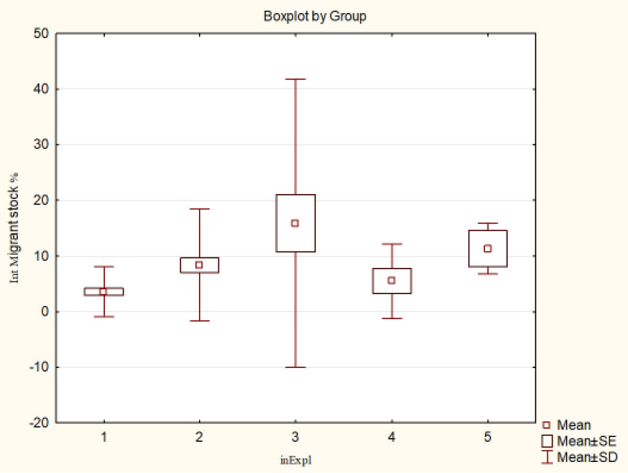 It is interesting to note that the benchmark did not respond to the variables reflecting the number of migrants and refugees in the country. According to many theoretical models, exploitation in the country should be expected to increase with the increase of the latter two phenomena. However, this is not the case, and if we consider the distribution of countries depending on the level of exploitation, we will see that the largest number of migrants is concentrated in countries with an average level of human trafficking (Figure 1).