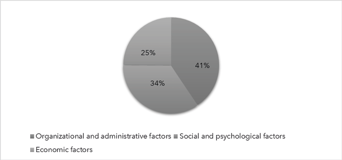 According to the experts, organizational and administrative factors had the strongest influence on the formation and development of employees’ innovation potential: the average score for this group was 2.56 out of 3.0, or 41%. The social and psychological ranked second, while economic factors ranked third2.16 (34%) and 1.56 (25%), respectively.