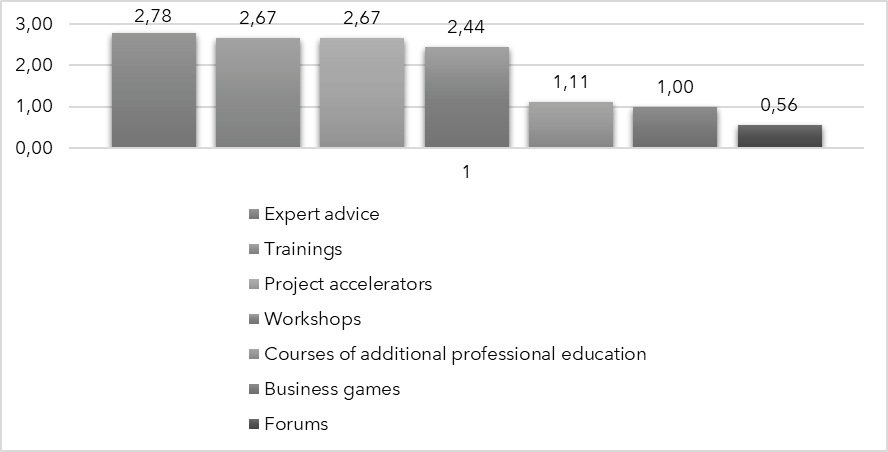 According to the experts, effective techniques for forming and developing employees’ innovation potential are training and project accelerators (2.67 points) and seminars (2.44). Such methods imply giving sufficient practical exercises, while project accelerators also develop and refine particular innovative proposals.
