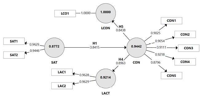 Para medir la proporción de varianza que se explica por el constructo (Bollen, 1989), se utilizó la prueba de la comunalidad (λi2) para cada variable manifiesta. Como se observa en el indicador SAT_1 el cual obtiene una carga factorial, λ = 0.9416, representando una comunalidad, λ2 = 0.8866, donde la varianza para la variable manifiesta se relaciona en un 88.66% con el constructo “Satisfacción” (tabla 2).